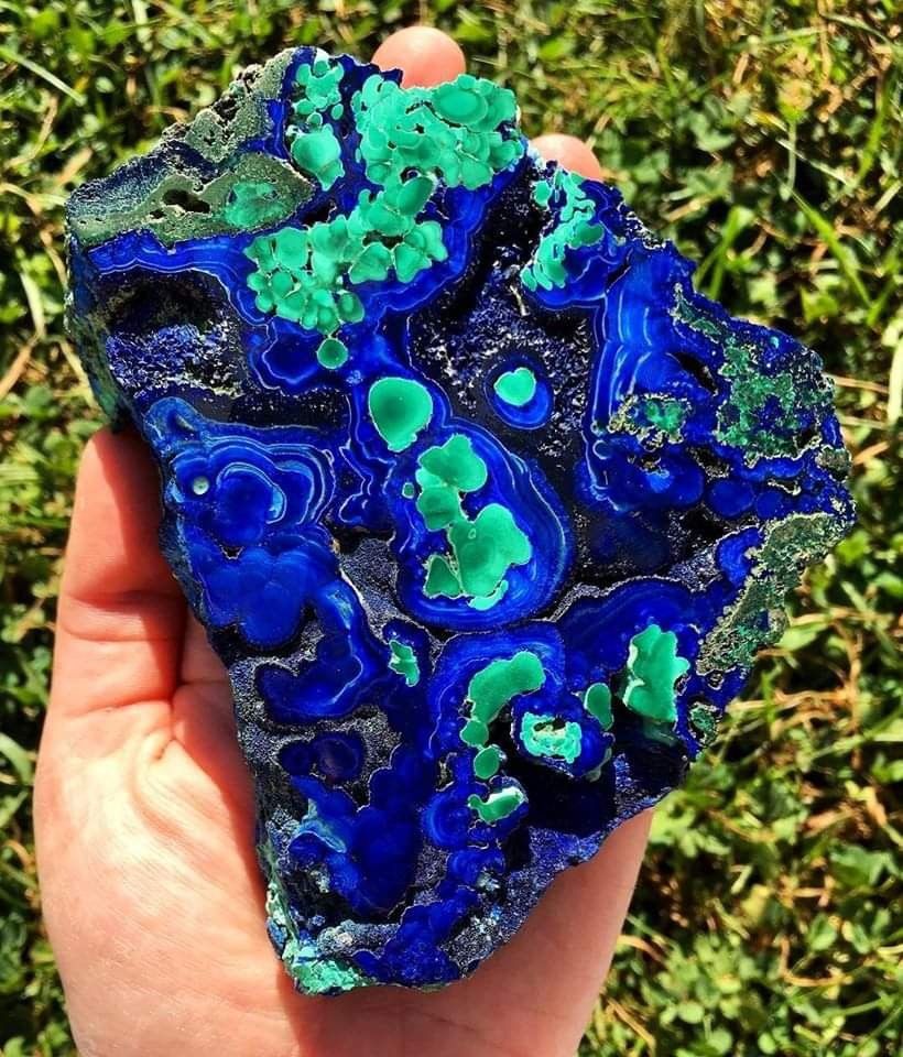 Fait intéressant : dans certaines pierres, on observe le processus d’oxydation en cours, donnant des cristaux à moitié bleus, à moitié verts.